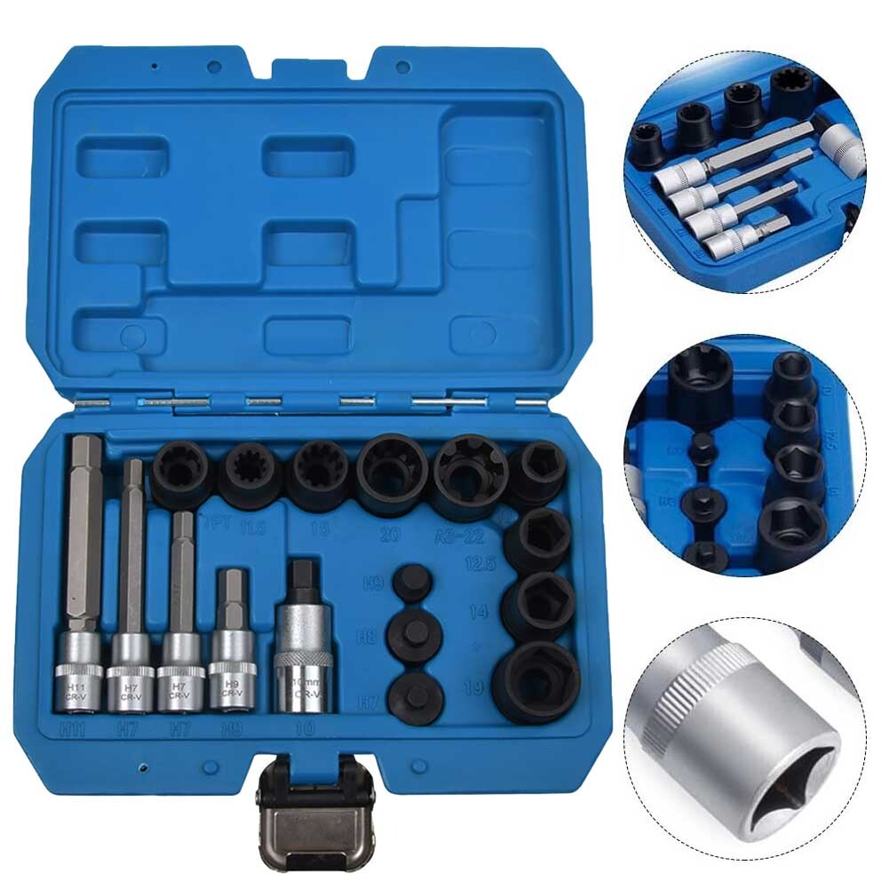 Includes a variety of hex (11-7-7-9-8-10), pentagon (10 mm-12.5 mm-14 mm-19 mm), and multi-point sockets and bits.(14-11.5-15-20-22)