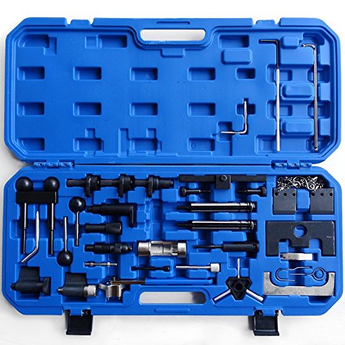 The set includes a variety of specific tools, such as camshaft and crankshaft locking tools, tensioner wrenches, and injection pump locking pins.
